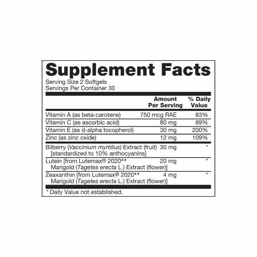 – **کمک به فیلتر کردن نور آبی**: با فرمولاسیون پیشرفته Lutemax® 2020، مانعی برای عبور نور آبی مضر از دستگاههای دیجیتال به چشم ایجاد میشود.